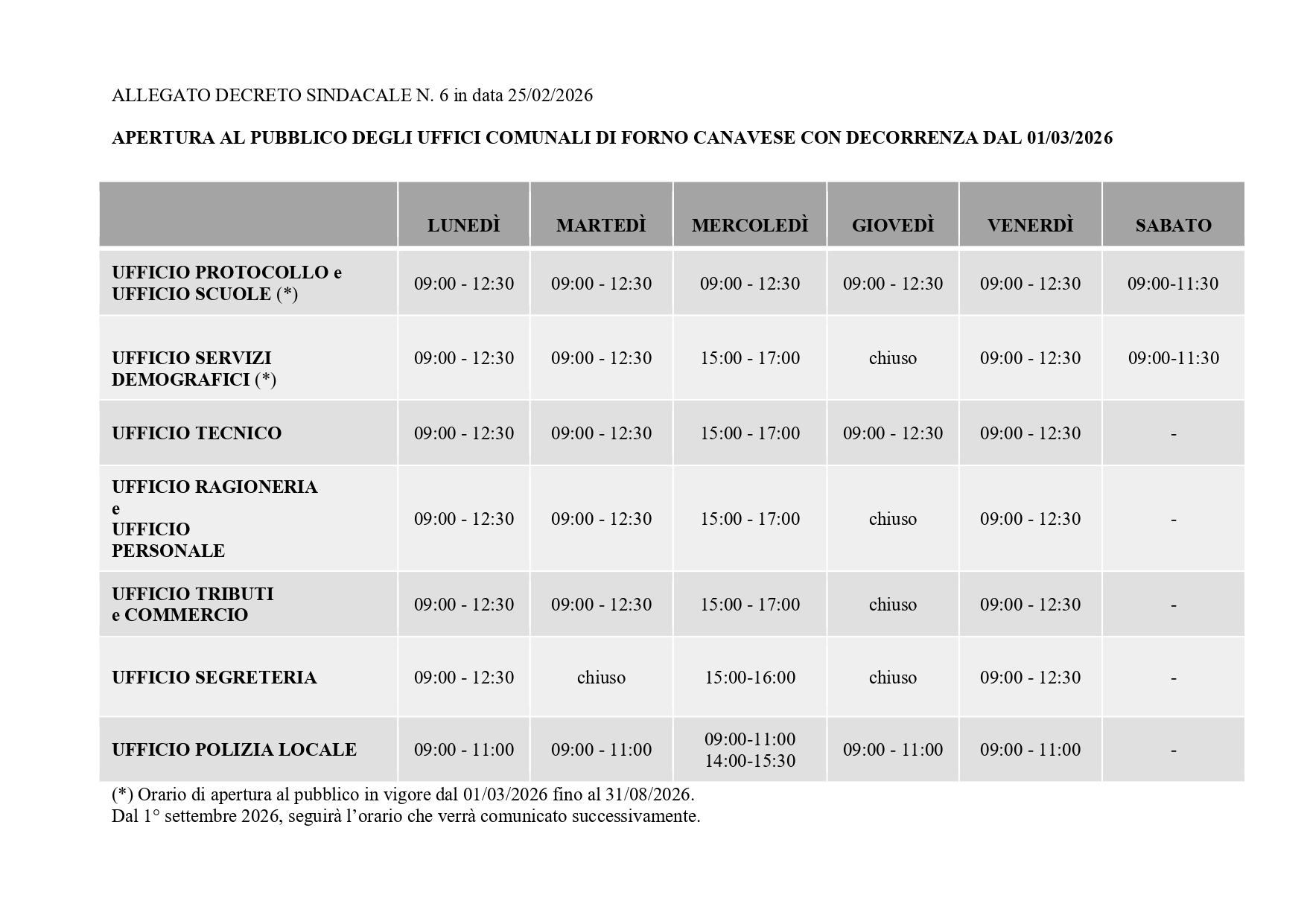 Con Decreto Sindacale n. 6 del 25/02/2026, è stato approvato il nuovo orario di apertura al pubblico degli uffici comunali di Forno Canavese, in vigore dal 1° marzo 2026.