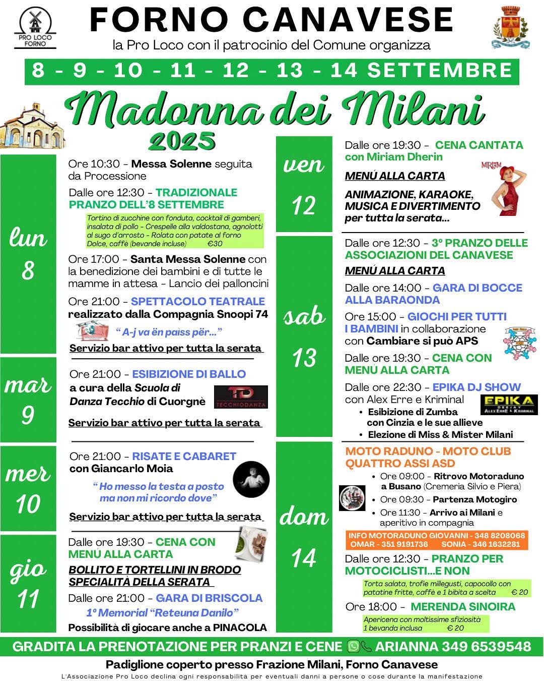 La Pro Loco con il patrocinio del Comune organizza nei giorni dall'8 al 14 settembre "Madonna dei Milani"