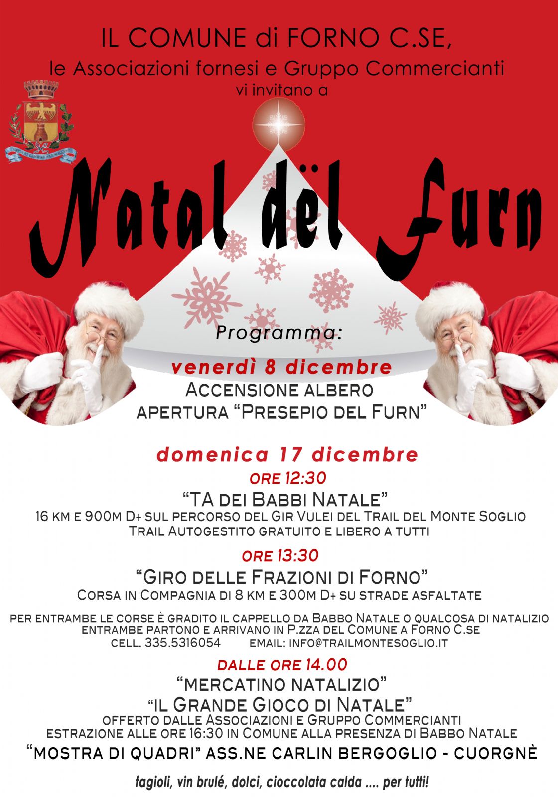 Vi invitiamo tutti domenica 17 dicembre al NATAL DEL FURN dalle ore 12.30 per partecipare alle corse gratuite di 16 e 8 km dei “Babbi Natale” organizzate da A.S.D. MONTE SOGLIO TRAIL e dalle 14.00 con le ASSOCIAZIONI FORNESI ed il GRUPPO COMMERCIANTI per il “Grande Gioco di Natale”. Non mancate di visitare: il meraviglioso PRESEPE DEL FURN presso la Parrocchia Assunzione di Maria Vergine e la “Mostra di Quadri” dell’ASS.NE CARLIN BERGOGLIO di Cuorgnè presso il Palazzo comunale. Il pomeriggio verrà allietato da musiche natalizie eseguite, per le vie del centro, dalla nostra favolosa FILARMONICA. Non mancheranno gli HOBBISTI e i COMMERCIANTI Fornesi per gli acquisti natalizi. Al termine, aspettiamo tutti i bambini, sotto l’Albero di Natale, per l’estrazione di premi alla presenza di BABBO NATALE.